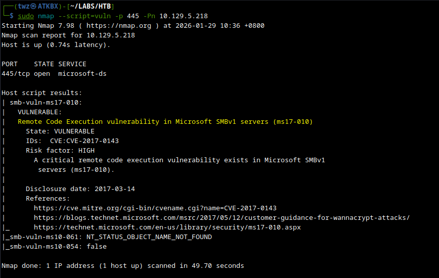 sudo nmap: Run Nmap.--script=vuln: Tells Nmap to run all scripts under thevulncategory.-p 445: Only scan the specified ports.-Pn: Skips host discovery (ping) and assumes that the target is online.10.129.5.218: This is the target machine.