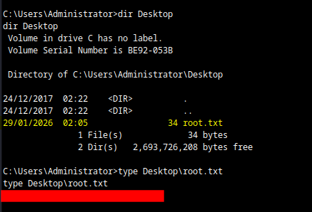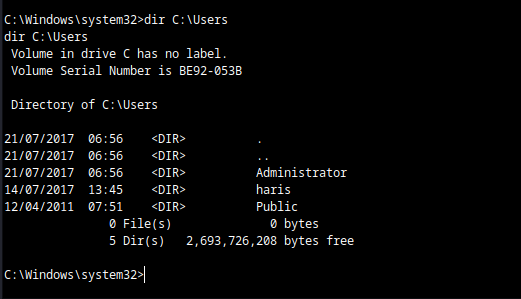 We then dig into the machine to gather more information such as available users/user profiles and sensitive files. Since we have SYSTEM privileges, we can access any files on the machine. In the screenshot below, we have the Administrator, haris, and Public user profiles.