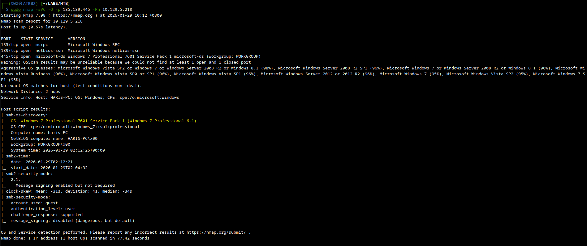 sudo nmap -sVC -O -p 135,139,445 -Pn 10.129.5.218